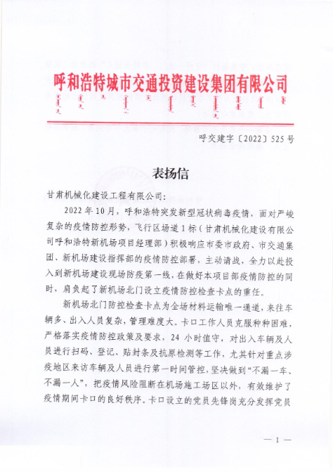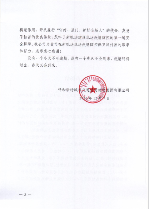 2022年12月7日,呼和浩特市交通投資建設(shè)集團(tuán)有限公司給我司發(fā)來表揚(yáng)信,表揚(yáng)信中充分肯定了我司呼和浩特新機(jī)場項(xiàng)目部在疫情防控工作上作出的努力,展現(xiàn)了我司的社會(huì)責(zé)任與擔(dān)當(dāng)。