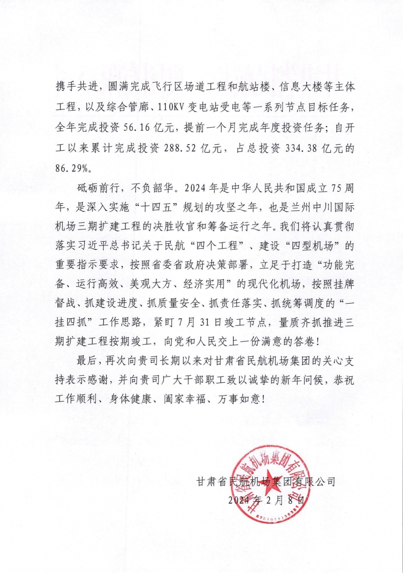 最后,甘肅省民航機(jī)場(chǎng)集團(tuán)有限公司再次向我司長(zhǎng)期以來(lái)對(duì)甘肅省民航機(jī)場(chǎng)集團(tuán)的關(guān)心支持表示感謝,并向我司廣大干部職工致以誠(chéng)摯的新年問(wèn)候!